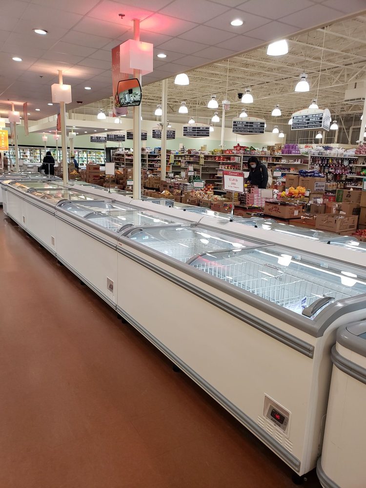The layout is bright and inviting, with neatly organized aisles filled with fresh produce, meats—including specialty items like frog legs—and an impressive assortment of sauces, spices, and snacks. The extensive collection of ramen and canned teas are particular highlights, capturing the taste of diverse Asian cuisines.